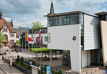 Durch die beiden Flügel des Neubaus und das „Alte Rathaus“, in dem weiterhin der Gemeinderat tagt und eine Galerie sowie eine Begegnungsstätte Platz gefunden haben, ergab sich Raum für einen öffentlichen Platz, der mit Bäumen und Wasserspielen gestaltet wurde. Er wird gern für Hocks, für den Weihnachtsmarkt und für Kundgebungen genutzt.