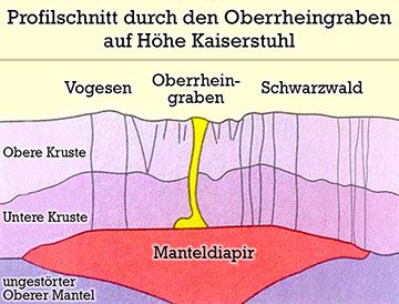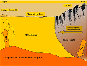 Diese bewirkten, dass die äußere feste Gesteinshülle stark gedehnt und aufgewölbt wurde. Die Erdkruste konnte der Beanspruchung nicht mehr standhalten und zerbrach. Im Scheitel der Bruchachse entwickelte sich nach und nach die Grabenstruktur.