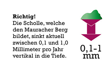 Auch heute noch senken sich Schollenpakete im Gebiet des Oberrheingrabens weiter in die Tiefe. Eines Tages könnte der Graben dadurch sogar unter den Meeresspiegel absinken und von Meerwasser geflutet werden! Das Rote Meer liegt beispielsweise im Bereich eines Grabens, der bereits vom Meer überschwemmt wurde. Der Mauracher Berg, auf dem sie gerade stehen, liegt in der Vorbergzone, die den Übergangsbereich zwischen Schwarzwald und Oberrheinischer Tiefebene bildet. In dieser Übergangszone finden sich zahlreiche Randschollen, die langsam absinken.