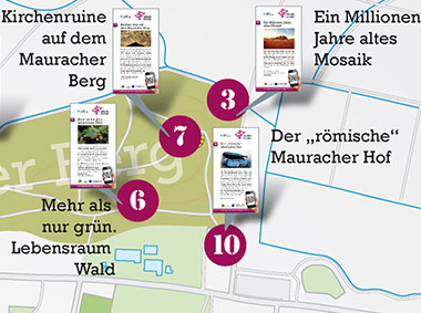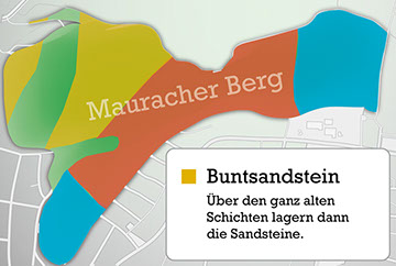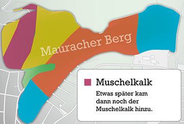 Quelle: Medienhaus Denzlingen, Foto Patrick DirrGeologische Übersichtskarte des Mauracher BergesQuelle: Medienhaus DenzlingenZeitachse der ErdgeschichteQuelle: DierckeDrei – Universalatlas (2009): Braunschweig: Westermann Verlag. S.10f., modifiziert.Grafiken PlattenbewegungQuelle: Falk, G.C. / Scholliers, M. (2010): Terra Physische Geographie. Klett, Stuttgart, S. 19