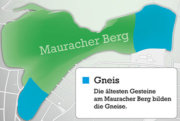 Die ältesten Gesteine am Mauracher Berg stammen aus dem Erdaltertum, dem Paläozoikum, das sich über einen Zeitraum von 494-294 Millionen Jahre vor heute erstreckt. Untergliedert wird das Erdaltertum in Kambrium, Ordovizium, Silur, Devon, Karbon und Perm. In diesem Zeitraum fanden diverse geologische Ereignisse statt: Gebirgsbildung, Faltungen, Versenkung und Aufstieg. Im Devon bewegt sich der Südkontinent Gondwana auf den Nordkontinent Laurasia zu. Im Karbon kommt es schließlich zur Kollision und es bildet sich eine große Landmasse, Pangäa. Diese Kollision führte zur Bildung des Variskischen Gebirges. Dies ist die Entstehungszeit der Gesteine unserer Grundgebirge. Granite dringen auf und bildeten mächtige Intrusivkörper, ältere Sedimentgesteine werden unter hohem Druck und hohen Temperaturen umgeformt (Metamorphose). Noch liegt unser Gebiet auf der Südhalbkugel, wandert aber stetig nordwärts. Granite und Gneise bilden die Hauptgesteinsarten des Grundgebirges. Ein typisches Merkmal der Gneise ist die Einregelung der Minerale, insbesondere der dunklen Glimmer (Biotite). Bei den Graniten handelt es sich um magmatische Gesteine (Plutonite), die aus in der Kruste erstarrter Gesteinsschmelze entstanden. Sie bestehen aus den oft rötlichen Feldspäten, den milchig weißen Quarzen und den Glimmern (zum Beispiel dunkler Biotit).