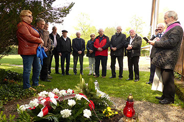 Nachträgliche Totenexequien am Grab von K. Dworak 2016, ganz links die Verwandten des bestatteten Kriegsgefangenen, rechts Diakon Josef Suschek