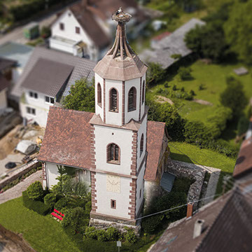 Abb. 2: Modell der Kirche St. Michael mit dem heutigen Turm vor der Südseite und mit dem ursprünglichen Kirchturm.