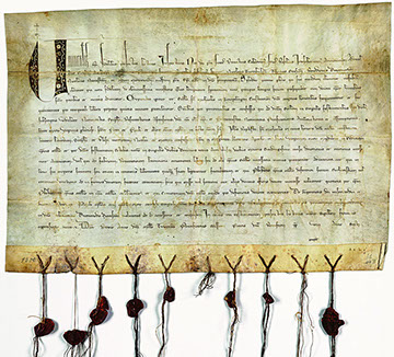 Abb. 1: Im ersten „Heligen Jahr“ (1300) ist diese Urkunde in Rom von drei Erzbischöfen und sieben Bischöfen für die Denzlinger Michaelskirche ausgestellt und mit den anhängenden Siegeln beglaubigt worden.