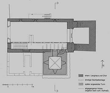Ursprünglich hat der Turm einmal im Osten der Kirche gestanden. Dort sind die Fundamente noch erkennbar. Damals öffnete sich das Langhaus zu einem Chorraum, der das unterste Stockwerk des Turmes bildete. Erst vermutlich im 16. Jahrhundert, als die Kirche ihre Funktion als Gotteshaus verloren hatte, ist der Turm im Süden an das Langhaus angebaut worden.