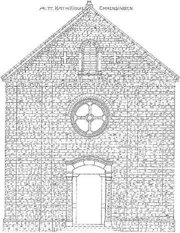 Bischof Knecht vermittelte auch das Angebot, die Steine der zu klein gewordenen Emmendinger Bonifatiuskirche, die 1862/63 nach Plänen von Heinrich Hübsch (1795-1863) erbaut worden war, für den Bau der Denzlinger Kirche zu nutzen. Der damals noch kleine Kreis von etwa 70 katholischen Männern erklärte sich bereit, die nummerierten Steine im Herbst/Winter 1911 mit Fuhrwerken nach Denzlingen zu transportieren, um sie dort wieder Stein für Stein aufzubauen (siehe Abb. 2). Am 5. Juni 1912 wurde die Baugenehmigung erteilt. Der Grundstein mit der Jahreszahl 1912 ist noch im Chor zu sehen.
