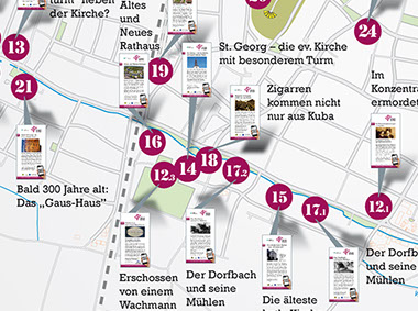Bis zum 18. Jh. lag das Zentrum des Dorfes Langen-Dentzlingen in der Nähe des „Storchenturms“. Noch im historischen Ortsplan von 1752 (siehe Abb. 1) ist die ursprünglich zentrale Lage des Ensembles, bestehend aus der ältesten Denzlinger Pfarrkirche St. Michael, der Gemeindestube (heute Gasthaus Rebstock-Stube: Tafel 22) und der Gerichtsstätte, die sich dazwischen befunden haben dürfte, zu erkennen (siehe Abb. 2). Nach dem Verkauf der Gemeindestube im Jahr 1798 verfügte die Gemeinde nicht mehr über ein eigenes Rathaus, sondern besaß nur noch zwei beheizbare Zimmer in diesem Haus.