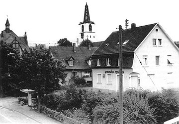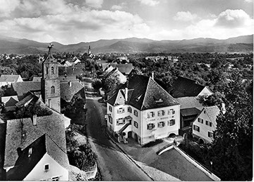 Abb. 2: Das alte Dorfzentrum mit Gemeinde-„Stube“ und Michaelskirche (um 1950).