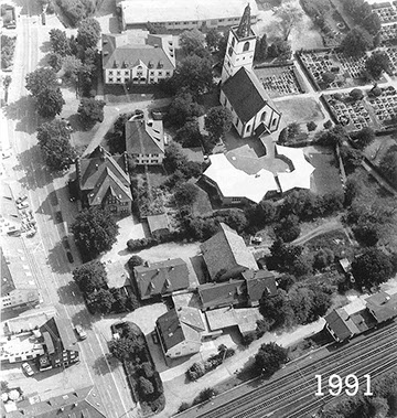 Abb. 5: Luftbild von 1991, im Vordergrund das Haus Martin und die Paracelsus-Apotheke (siehe Abb. 6), und Luftbild von 2018