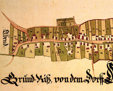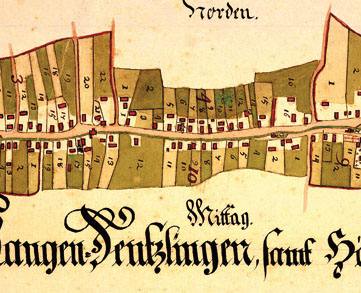 Abb.1: Grund-Riß von dem Dorff Langen-Dentzlingen, samt Häußer und Gärthen (von 1752) (Generallandesarchiv Karlsruhe H/Denzlingen Nr. 6)