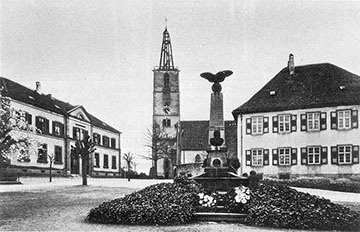 Abb. 3: Der Vorplatz vor der ev. Kirche St. Georg: Links das Schulgebäude, rechts das Pfarrhaus, im Vordergrund das Brunnen- und Kriegerdenkmal zur Erinnerung an den „ruhmreichen Feldzug 1870-1871 gegen Frankreich“. Der Platz wurde in der NS-Zeit nach dem Gauleiter Robert Wagner (1895-1946) benannt (s. auch Abb. 4).