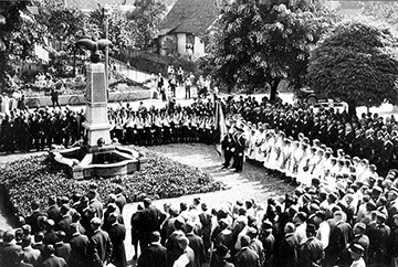 Abb. 4: Kundgebung am Brunnen- und Kriegerdenkmal in den 1930er Jahren (Blick vom Pfarrhaus aus).