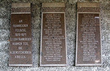 Abb. 5: Die Tafeln mit den Namen der 42 Teilnehmer, die „am ruhmreichen Feldzug 1871-1872 gegen Frankreich“ teilgenommen haben, befinden sich heute rechts vor der Friedhofshalle.