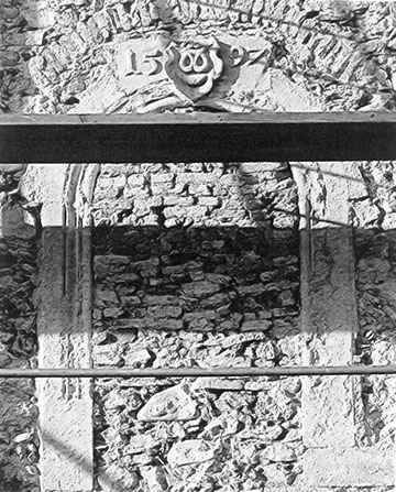Die zunächst geäußerte Vermutung, dieser Stein sei „ohne Bezug zur inneren Raumaufteilung … in die Außenmauer eingemauert“ worden, er sei „aus einem anderen Zusammenhang übernommen und an seiner heutigen Stelle als Spolie sekundär versetzt worden (Mitteilung vom 28.5.2018), hat Herr Dr. Cremer korrigiert, als ihm vom Autor ein Foto aus dem Jahre 1983 (siehe Abb. 1) gezeigt wurde, auf dem die Fassade ohne Putz zu sehen ist: „Das Foto zeigt, dass der Stein mit Datierung und Zunftzeichen den Abschluss einer vermauerten rundbogigen Öffnung ist, deren Gewände umlaufend profiliert ist und deren etwa brüstungshohe Basis durch quadratische Überstabungen markiert ist. Dass nicht nur der Scheitelstein, sondern die gesamte Öffnung noch in der Fassade vorhanden und zudem von einem gemauerten Entlastungsbogen überfangen ist, darf als Hinweis darauf gedeutet werden, dass der Scheitelstein nicht nachträglich als Spolie in die Wand eingebaut wurde. Vielmehr ist wohl davon auszugehen, dass es sich hier um die Rahmung einer Ladenklappe einer Brotausgabe, also einen sogenannten. Brotscharren handelt. Solche Bäcker – oder Metzgerscharren (auch Scharrn, Scharne oder Schirn genannt) sind etwa in Spätmittelalter und Renaissance an Markthallen oder Rathäusern, aber auch an Gebäuden der entsprechenden Zunft überliefert.“