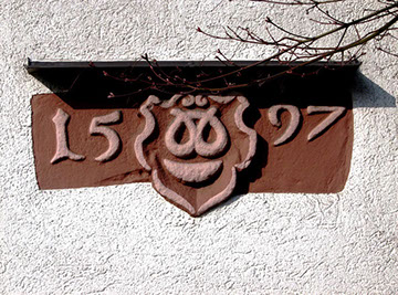Abb. 2: Die Jahreszahl 1597 am „Stapflehus“ mit dem Zeichen des Bäckers über dem ehemaligen Eingang (von der Dorfstraße/Hauptstraße her)