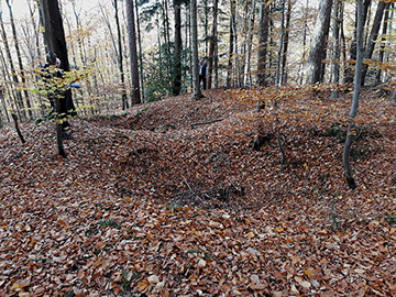 Bereits in römischer Zeit wurde am Mauracher Hof in Denzlingen Eisenerz verarbeitet. Möglicherweise stammt das Erz vom Einbollen. Denn dort gibt es mehrere Eisenerzvorkommen. Neun sogenannte „Pingenzüge“ sind über den Berg verteilt aufzufinden. Sie geben Aufschluss darüber, dass früher umfangreicher Bergbau stattfand. Der Stolleneingang, vor welchem wir stehen, führt ca. 40 m in den Berg hinein (siehe Foto) und endet dann. Vielleicht sollte er auch die oberen Bergwerke im Suggental entwässern, wurde aber vorzeitig aufgegeben.