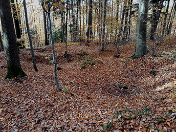 Weiter oberhalb des Stolleneingangs befinden sich, wie die Karte zeigt, zahlreiche „Pingenzüge“. „Pingen“ sind trichterförmige Einbrüche über Hohlräumen, die durch den Bergbau entstanden sind. Sie können auch durch Probegrabungen an Stellen entstanden sein, wo man Erzvorkommen vermutete. Jedenfalls sind die ungewöhnlich zahlreichen Pingen auf dem Einbollen Folgen der intensiven Suche nach Erz.